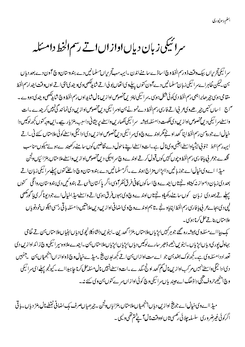 Here i discussed about these probelms with back ground , origin and nature of Arabic ,persian ,Dewnagri and Gurmukhi scripts .I suggessted persian script for Siraiki with new symbols for additional siraiki sounds which are not in Persian .Arabic.Urdu and Punjabi